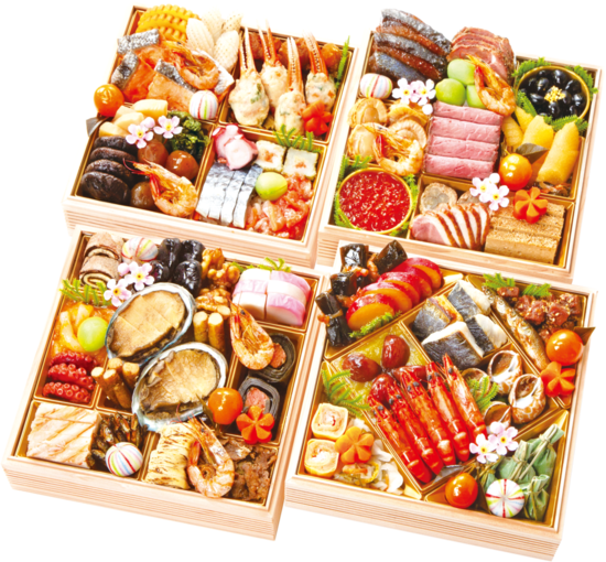 柿鳴門・お多福豆・てまり餅、くるみ甘露煮・紅白蒲鉾、黄金いか・たこ小倉煮、若桃甘露煮・あわび煮・わかめ煮、レモンくらげ・たたきごぼう、金柑甘露煮・紅鮭昆布巻、小海老の蜜煮・梅型ねじり人参煮、カニ紅白真丈・田作り煮、てまり餅・焼ゆば巻、牛肉しぐれ煮