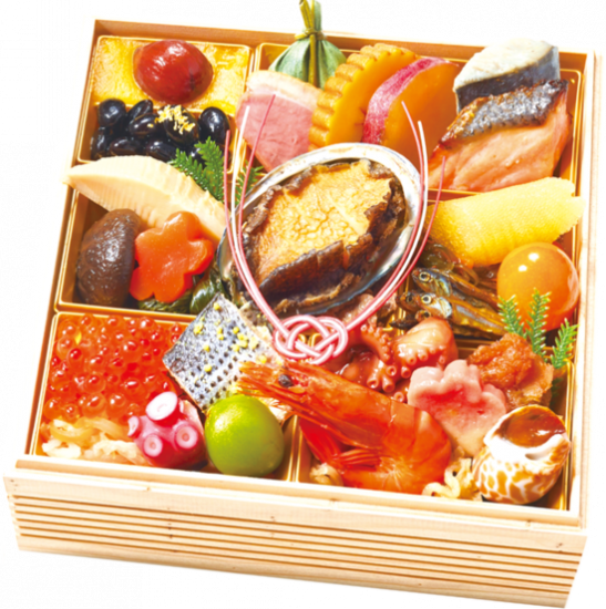 きんとん、渋皮栗甘露煮、黒豆煮、金箔、笹茶巾餅、合鴨スモーク、伊達巻、さつまいも甘露煮、サワラ西京焼、鮭味噌幽庵焼、筍煮、しいたけ煮、菜の花煮びたし、花こんにゃく煮、牛肉のしぐれ煮、あわび煮、味付数の子、松前漬け、田作り煮、金柑甘露煮、味付いくら、なます、こはだ粟漬け、たこ梅酢和え、若桃甘露煮、たこ照焼、海老旨煮、切干大根煮、たら煮、ばい貝煮、梅麩甘煮